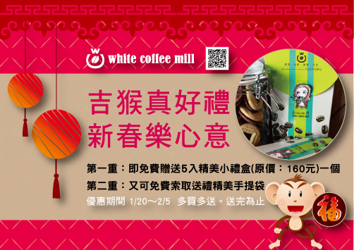 2016 新春吉祥好禮1+1 第一重:凡購買大袋60入或30入任何口味白咖啡(或印度拉茶)滿2袋 即免費贈送5入精美小禮盒(原價160元)一個(口味隨機出貨,恕不挑選) 第二重:凡有選購30入袋商品 又可免費索取送禮精美手提袋(一袋30入僅可以索取一只,依此類推) 優惠期間 1/20~2/5 多買多送。送完為止 (僅限於白咖啡官方網站下單)